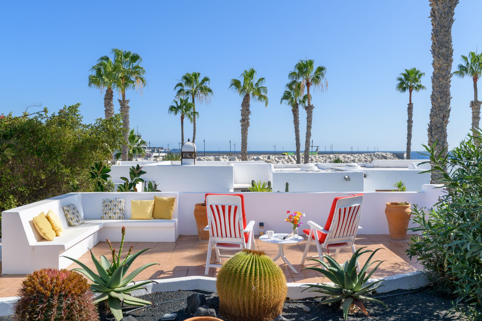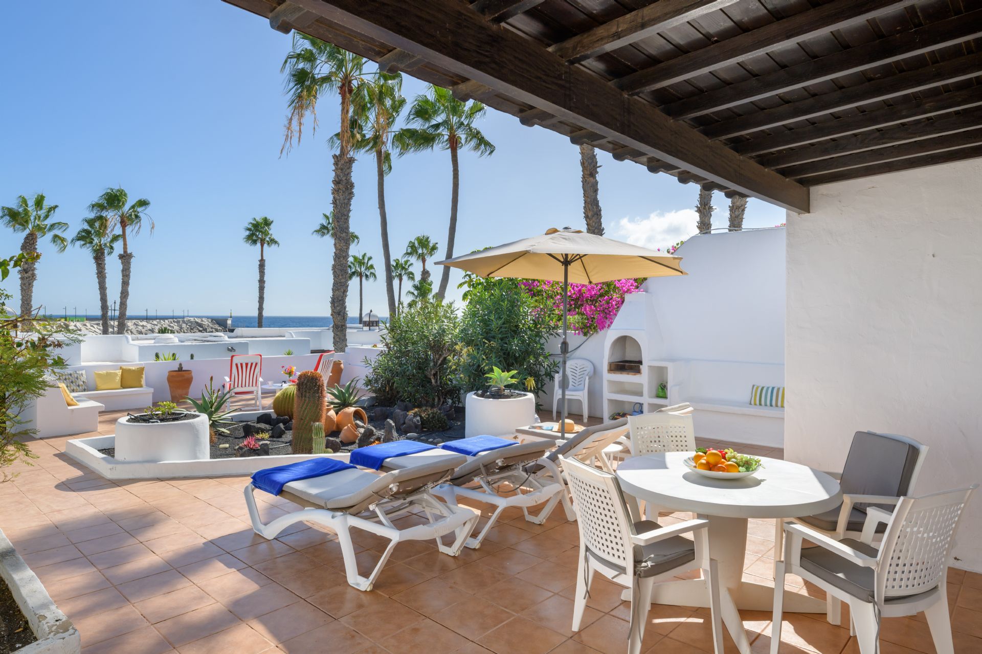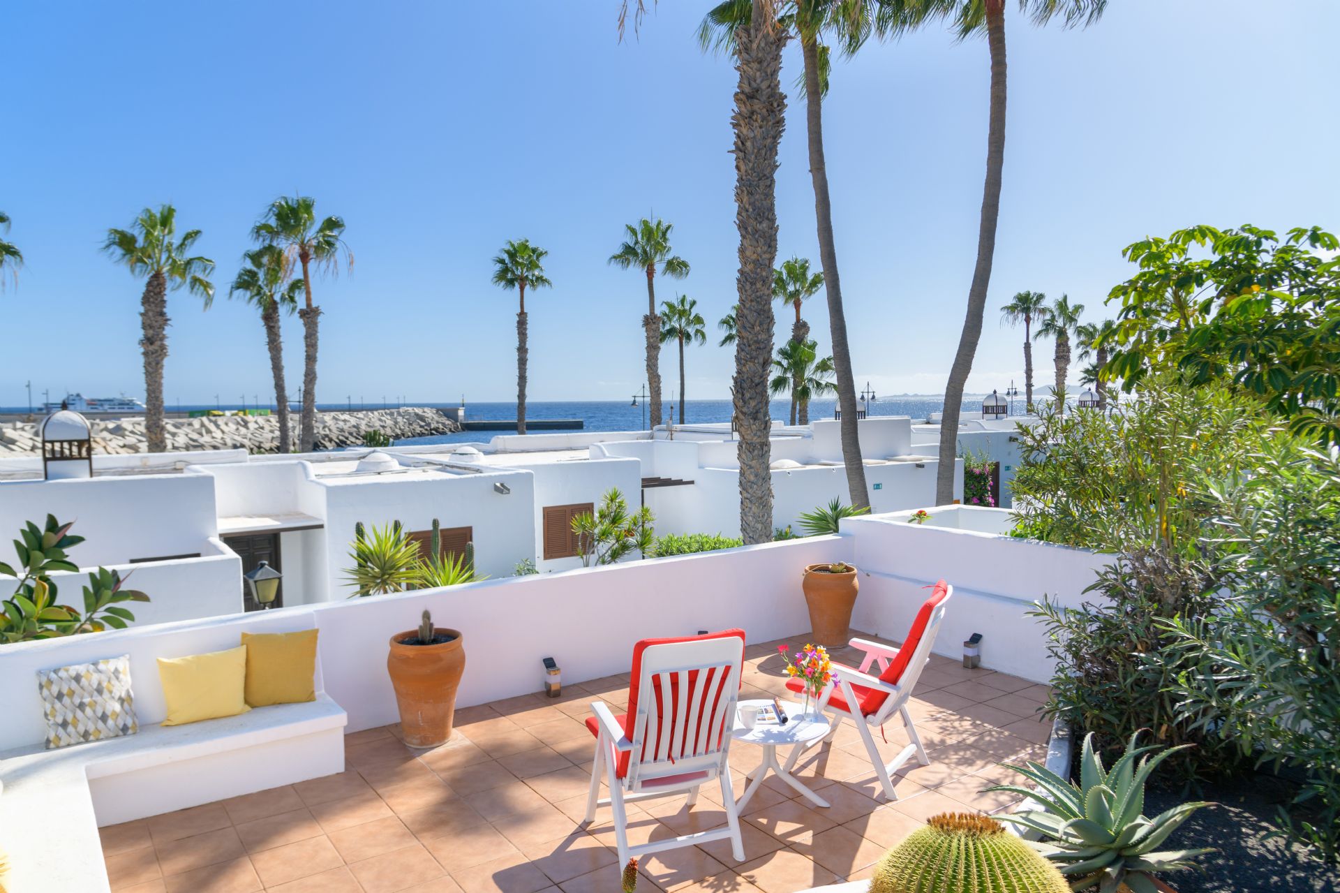 Exterior: Puerto Chico 4 has a private terrace/patio area which leads out from the living room. It features patio furniture and a built in barbeque perfect for eating alfresco and lovely sea views. The heated communal pool is located in the centre of the complex down the steps at the rear of the patio and through the mature gardens. Situated on the best complex in Playa Blanca, Puerto Chico offers guests a stunning front line location, lovely sea views, a large heated pool, mature gardens, a selection of international TV channels plus a reception on site.